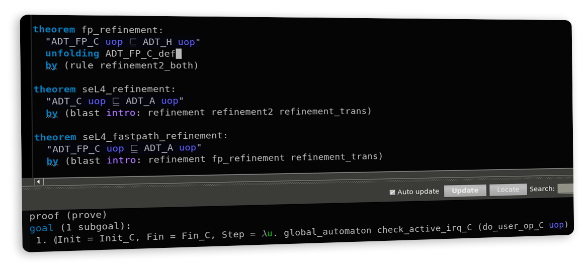 • within tools that can be used for formal machine-checked proof, the seL4 proofs use the proof assistant Isabelle/HOL, which is engineered to minimise the code that needs to trusted for the proof to be correct — see more on the assumptions page.